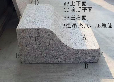 本案例中,吊裝搬運(yùn)難點(diǎn)在于,石材吊夾位置選擇。S型路沿石與其他類型路沿石大的差異在于,其結(jié)構(gòu)特殊性。S型路沿石有上下左右四個(gè)平面,如圖所示,C、D、E、F這四個(gè)平面。然在實(shí)際吊裝過(guò)程中,這四個(gè)平面吊夾搬運(yùn)在實(shí)際施工過(guò)程中并不方便。